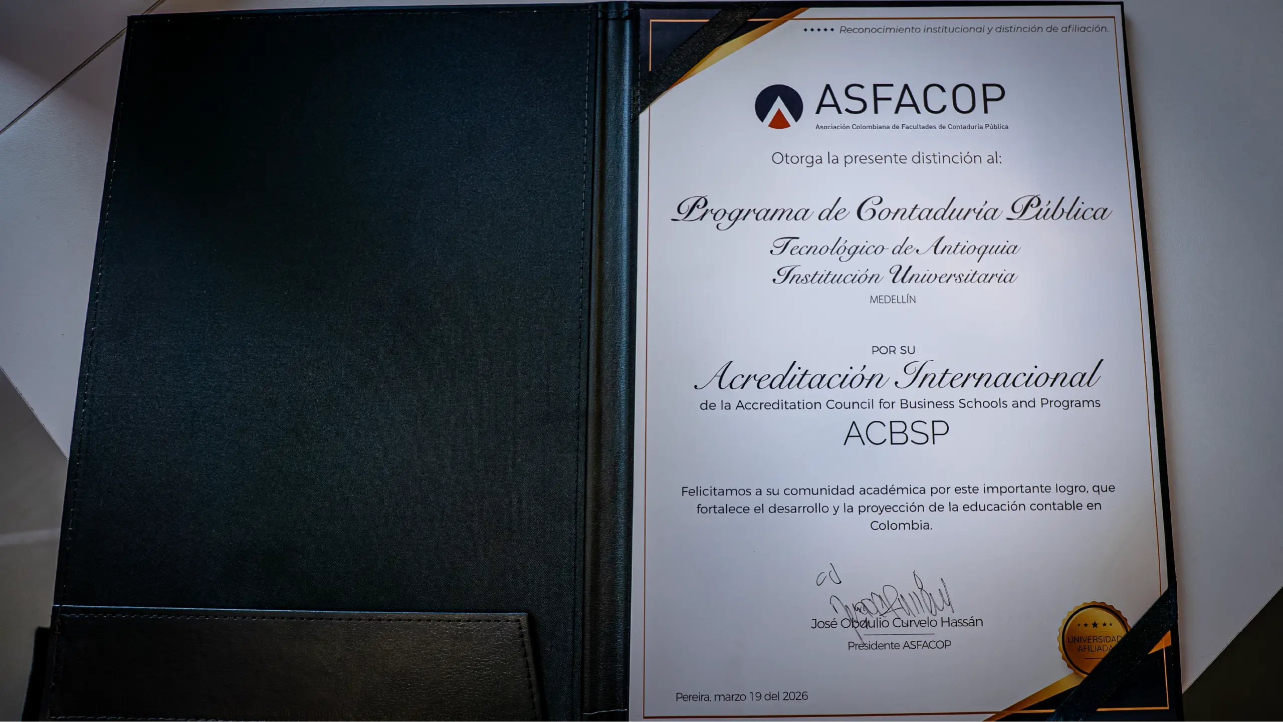 La distinción otorgada al TdeA puso en primer plano la acreditación internacional concedida por la Accreditation Council for Business Schools and Programs (ACBSP), y felicitó “a su comunidad académica por este importante logro que fortalece el desarrollo y la proyección contable en Colombia.