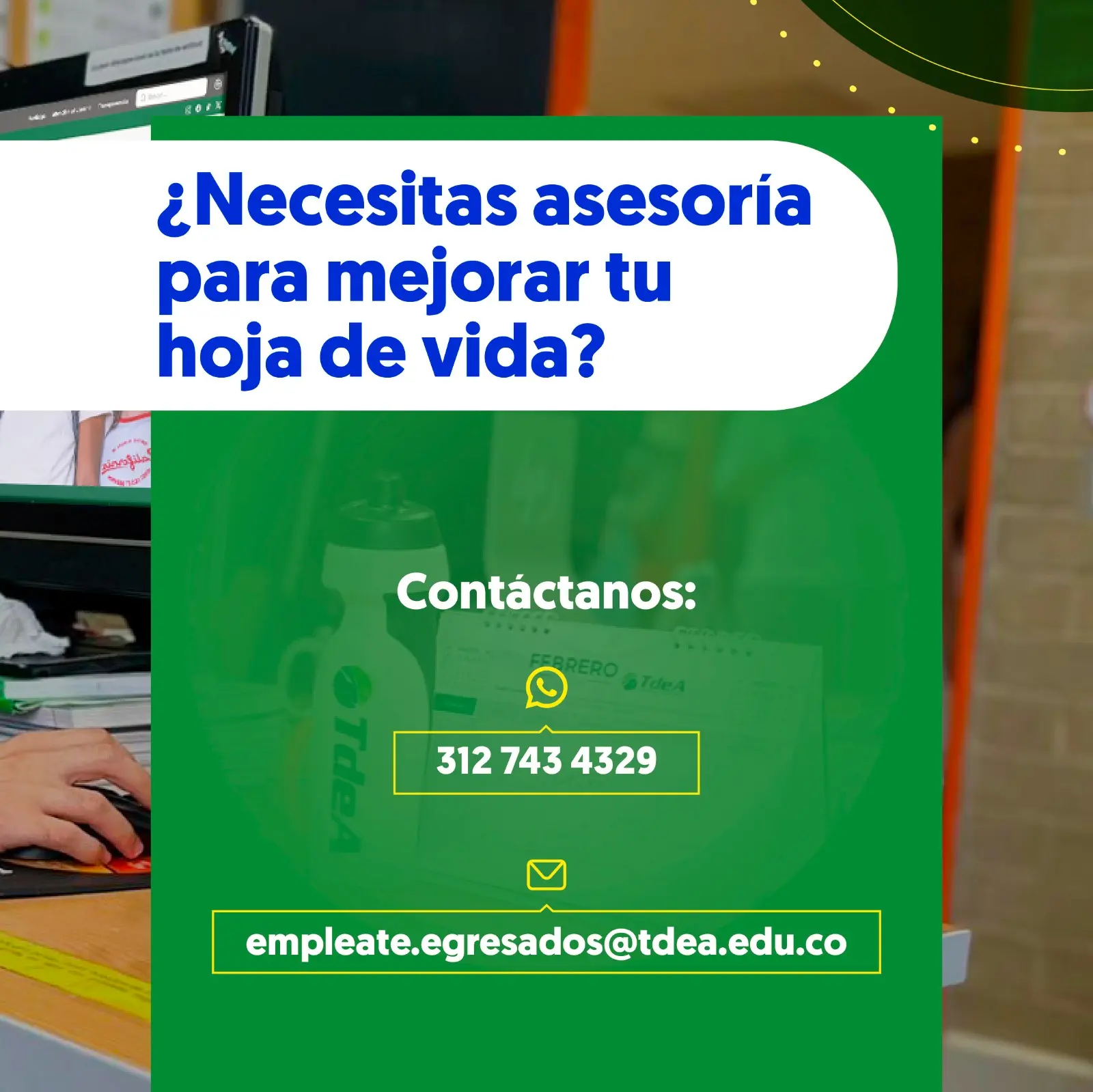Da a conocer tus necesidades de talento y recibe postulaciones de nuestros egresados, cuéntanos mas de éstas en el correo: empleate.egresados@tdea.edu.co