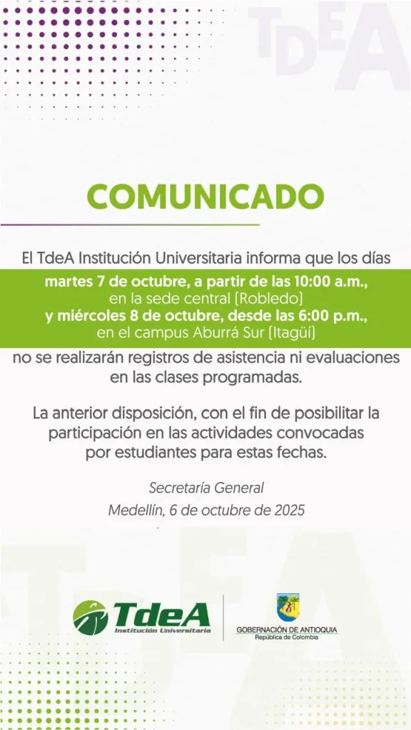 Medellín, 12 de noviembre de 2025. El Consejo Directivo del Tecnológico de Antioquia Institución Universitaria (TdeA) convoca a la elección del Rector, para un período de cuatro años, de acuerdo con el cronograma aprobado por este organismo. La convocatoria se publicó el 12 de noviembre de 2025 y la inscripción de candidatos será entre el […]