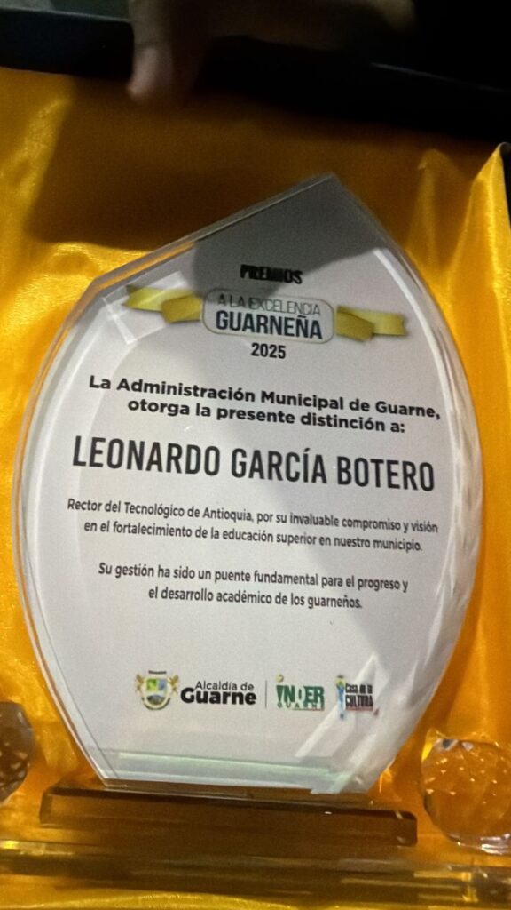 En una ceremonia cargada de emoción y reconocimiento, la Administración Municipal de Guarne, el 27 de marzo de 2026, realizó la gala de los Premios a la Excelencia, en la que fueron exaltados el rector del TdeA, Leonardo García Botero y la secretaria General, Marcela Giraldo Girado, por el compromiso y aportes a la educación superior en los territorios.