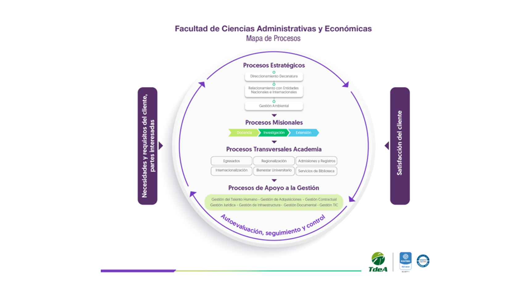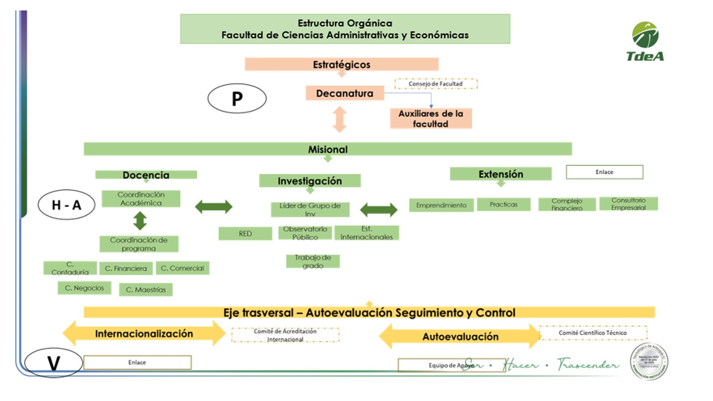 El TdeA y la FCAE, reconocen la importancia de establecer procesos sistemáticos de liderazgo que impulsen la excelencia en el desempeño y promuevan la mejora continua. Este estándar enfatiza la integración de valores y expectativas en los procesos de liderazgo de la Facultad, destacando su compromiso con las responsabilidades sociales y su participación en la comunidad. Al establecer una cultura de liderazgo orientada hacia la excelencia y la responsabilidad social, la facultad se posiciona como un agente de cambio positivo, no solo en el ámbito educativo, sino también en el desarrollo integral de la sociedad a la que sirve, así, en el presente apartado, se muestra la forma en que de manera sistemática se promueve por parte de la alta dirección de la FCAE, para sus programas de pregrado el mejoramiento continuo y la integración con las necesidades y expectativas de las partes de interés pertinentes a la Facultad.